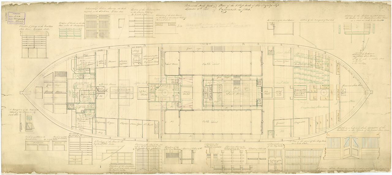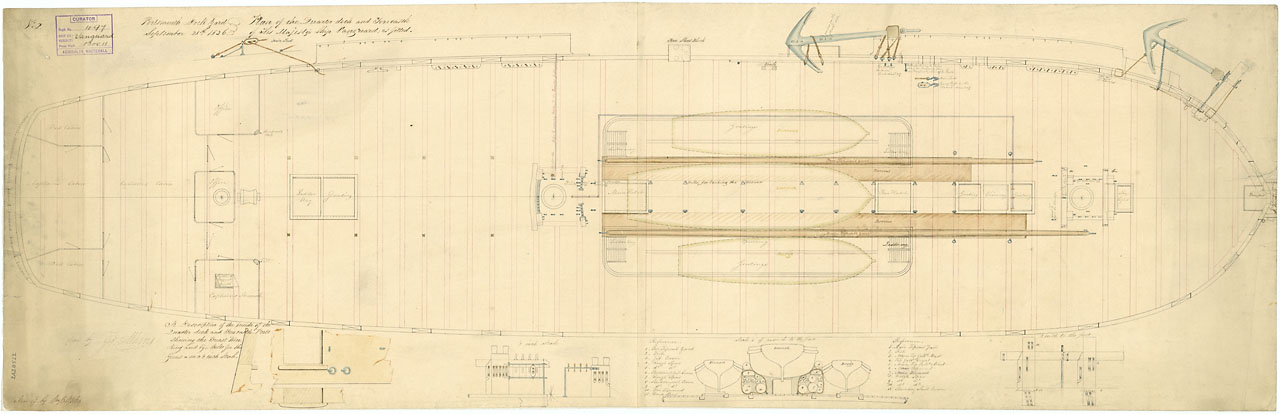 Vanguard (1835). Scale: 1:48. Plan showing the lower deck with elevations of details, for Vanguard (1835), an 80-gun Second Rate, two-decker, as fitted at Portsmouth Dockyard.