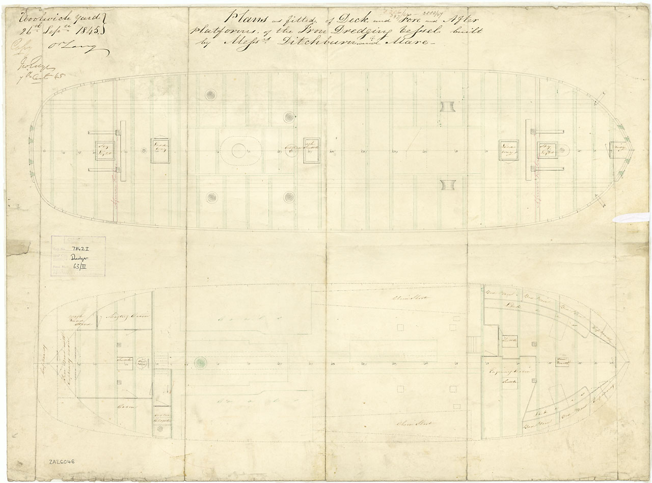 Vernon (1832). Scale: 1:48. Plan showing the quarterdeck and forecastle for Vernon (1832), a 50-gun Fourth Rate, large Frigate, as fitted as the flagship for Rear-Admiral Samuel Hood Inglefield, Commander in Chief of the Brazil and River Plate Station.
