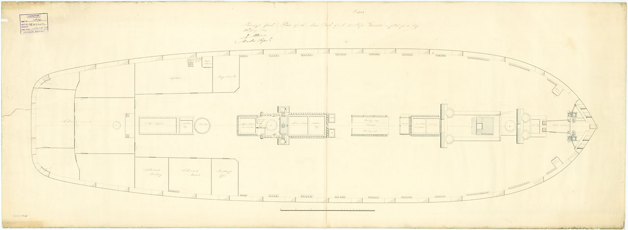 Vernon (1832). Scale: 1:48. Plan showing the main deck (upper deck) for Vernon (1832), a 50-gun Fourth Rate, large Frigate, as fitted as the flagship for Rear-Admiral Samuel Hood Inglefield, Commander in Chief of the Brazil and River Plate Station.