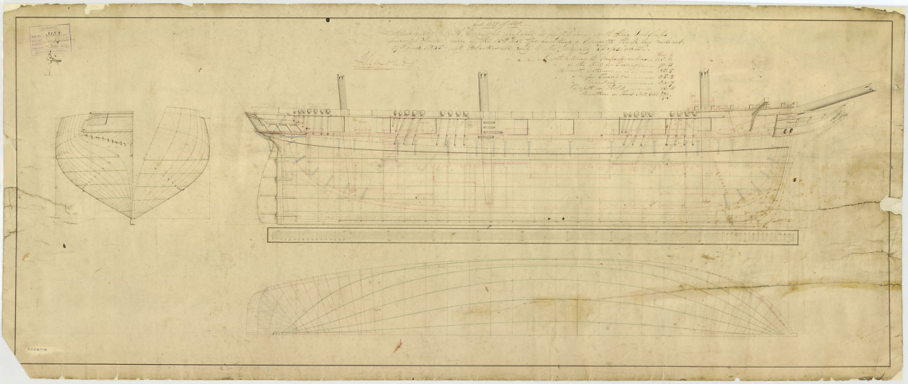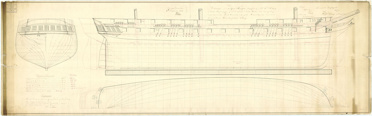 Trafalgar (1841). Scale: 1:48. Plan showing the inboard profile for Trafalgar (1841), a 120-gun First Rate, three-decker, as fitted at Sheerness Dockyard after launch at Woolwich Dockyard. The plan illustrates the round bow, circular stern, and internal b
