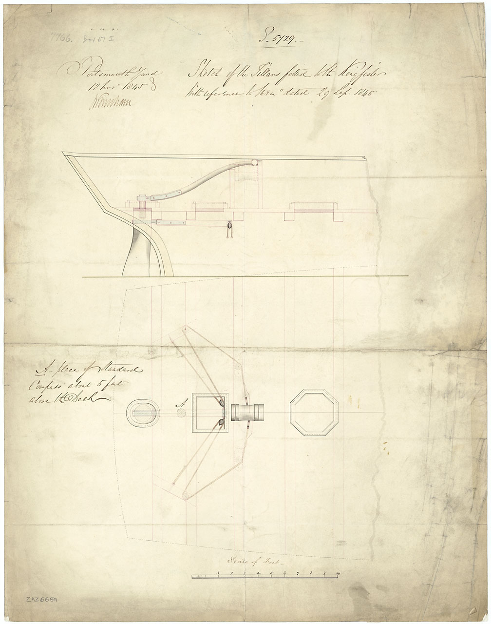 Trafalgar (1841). Scale: 1:48. Plan showing the roundhouse for Trafalgar (1841), a 120-gun First Rate, three-decker, as fitted at Sheerness Dockyard after launch at Woolwich Dockyard. The plan illustrates the rigging of two iron davits over the stern.