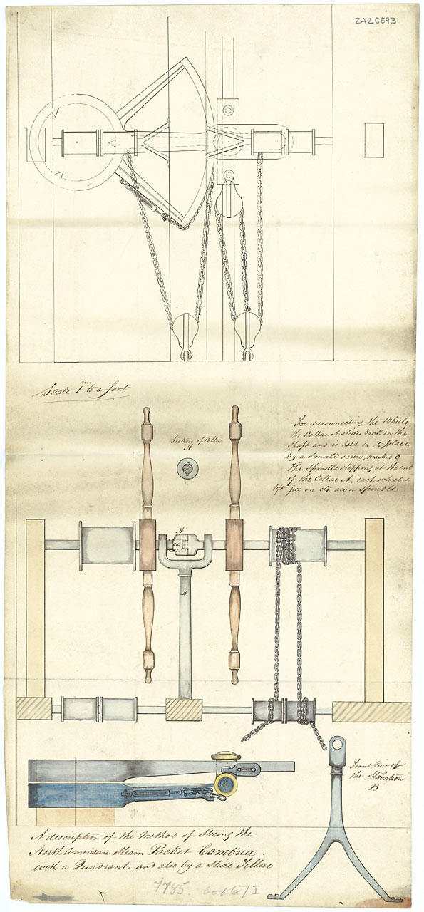 Cambria (fl.1845). Scale: 1:12. Plan showing the elevation, plan, and section of the method of steering for the North American Steam Packet Cambria (fl.1845).