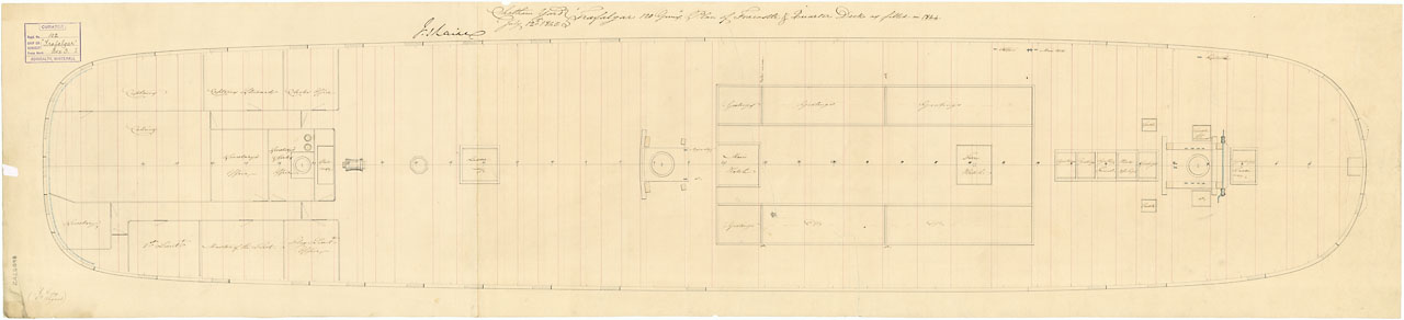 Trafalgar (1841). Scale: 1:48. Plan showing the quarterdeck and forecastle for Trafalgar (1841), a 120-gun First Rate, three-decker, as fitted at Sheerness Dockyard after launch at Woolwich Dockyard. The plan illustrates the cabin arrangements and some de