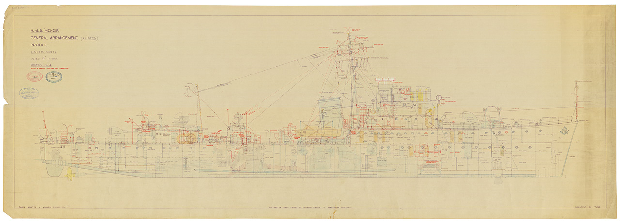 Mendip (1940). Scale 1:48. A plan showing the inboard profile for the Mendip (1940), an escort deatroyer, as fitted. the oplan includes alterations up to 1948.