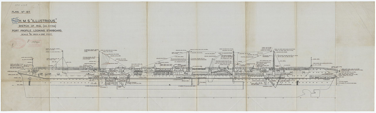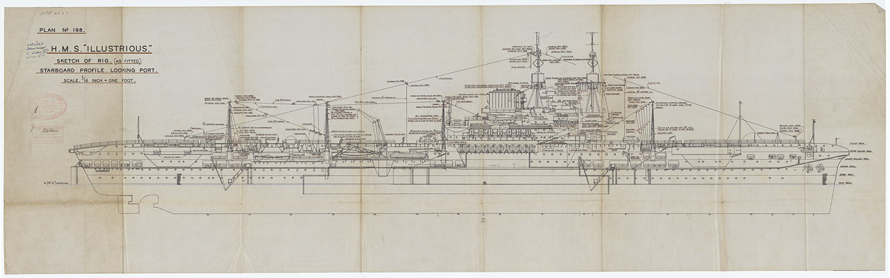 Illustrious (1939). Scale: 1:192. Plan showing the starboard profile (bow to right), looking port, of rig for the fleet aircraft carrier HMS Illustrious (1939), as fitted in 1940.