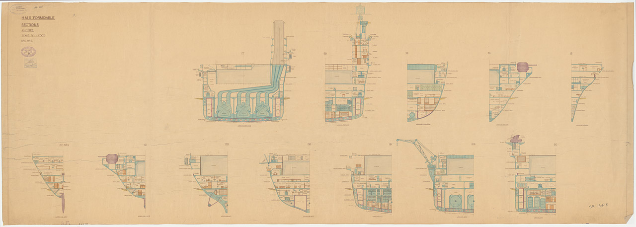 Formidable (1939). Scale 1:96. Plan showing sections: Full Section at fr 77 looking forward, half sections at frs 66 l/f, 52 l/f, 33 l/f, 15 l/f, 90 looking aft, 109 l/a, 119 l/a, 132 l/a, 150 l/a, 161 l/a, AP (168 1/4) l/a. for the fleet aircraft carrie