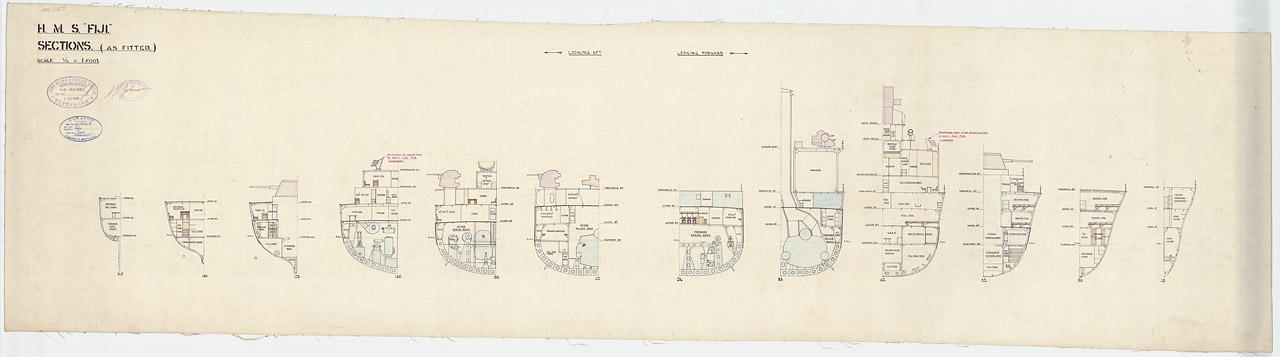 Fiji (1939). Scale 1:96. Plan showing the general arrangement sections at A.P., frs 187, 172, 145, 133, 117, (stbd side, looking aft); 96, 86, 69, 49, 26, 13, (stbd side, looking forward) for the cruiser HMS Fiji (1939), as fitted.