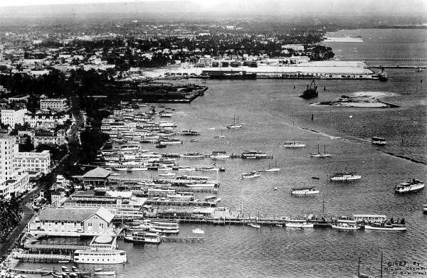 Unidentified woman standing next to an automobile parked along the bay: Coral Gables, Florida