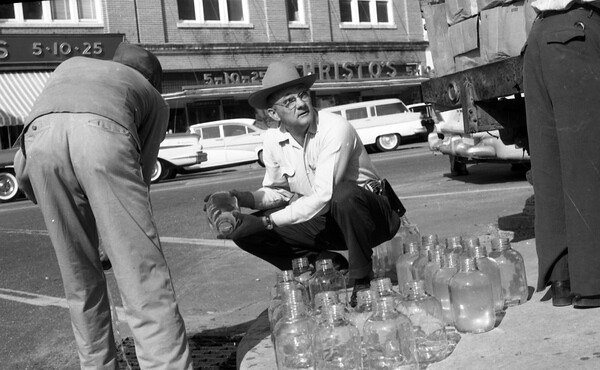 Gadsden County Deputy Sheriff Robert Martin pouring confiscated whiskey down the drain in Quincy