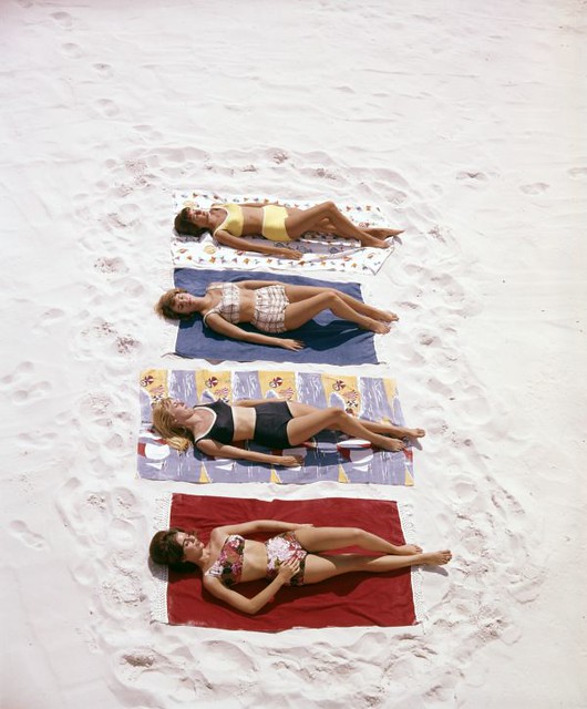 Women modeling two-piece bathing suits at Pensacola Beach