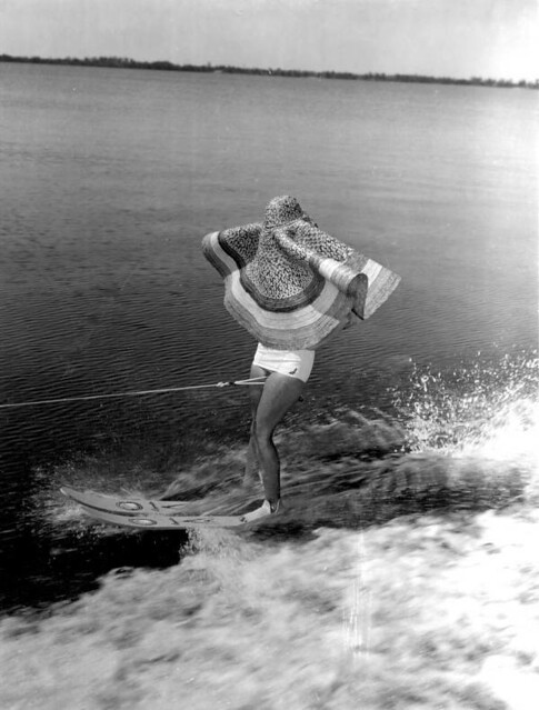 Young woman stunt water skiing with a large hat covering her face - Cypress Gardens