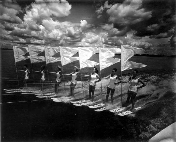 Seven women on water skis holding flags - Cypress Gardens