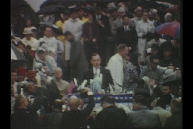 Richard Nixon laughing with Governor Claude Kirk and bride, Erika Mattfield Kirk, during their wedding celebration: Palm Beach, Florida
