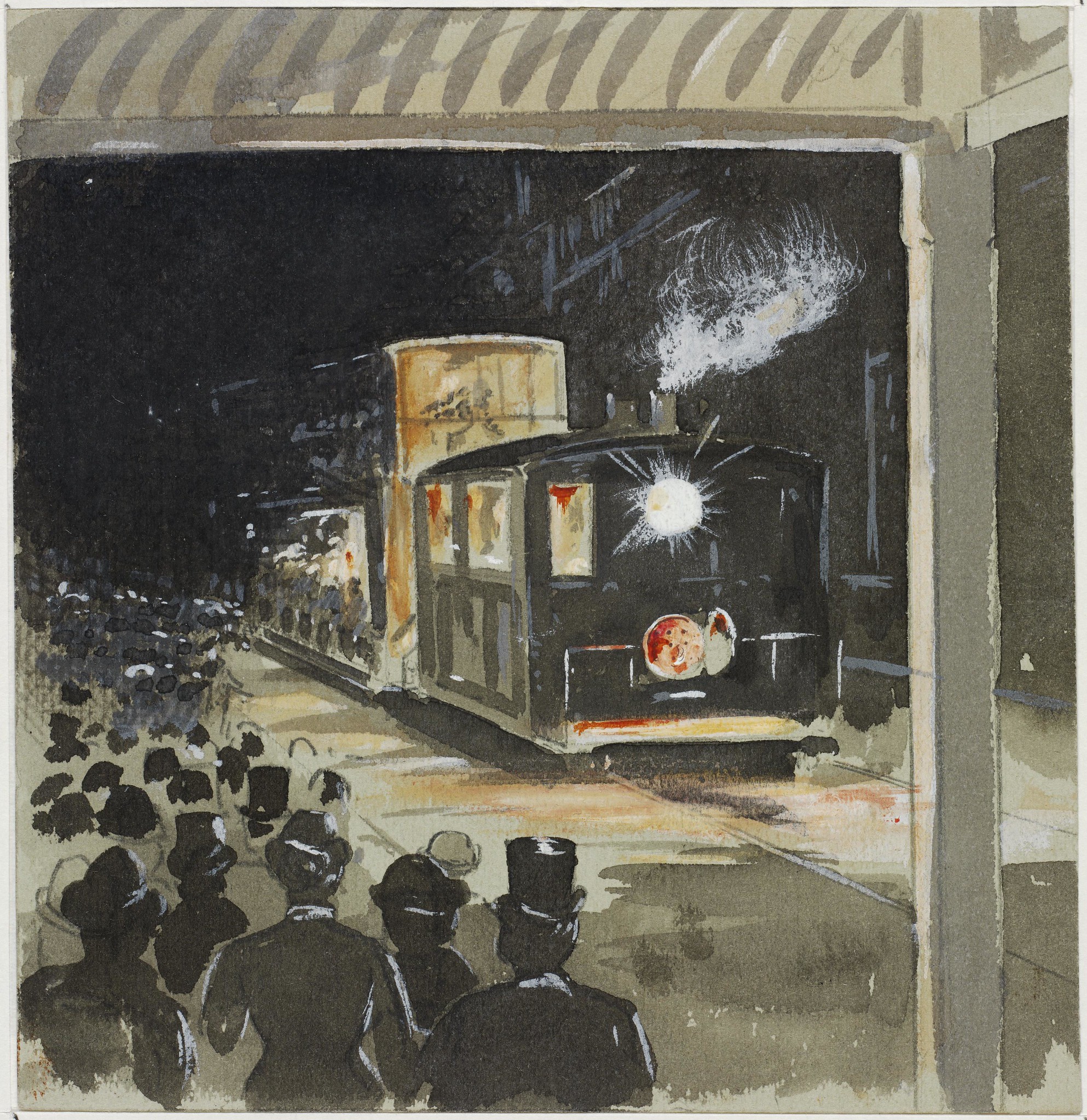 King and Elizabeth St. drawn on the first night that the first tram ran, c. 1879 / drawn by J. Flynn