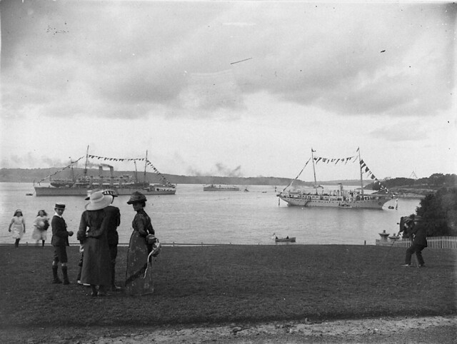 Spectators on the lawn of Government House view the arrival of the first Royal Australian Navy, Sydney, Oct 1913