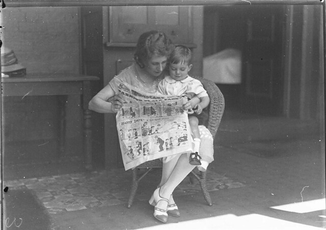 Musical comedy star Dorothy Brunton reading Sid Nicholl's Fashion-plate Fanny in the children's section of The Sun newspaper with a small boy at St. Margaret's Hospital, Sydney, January 1925 / Sam Hoo
