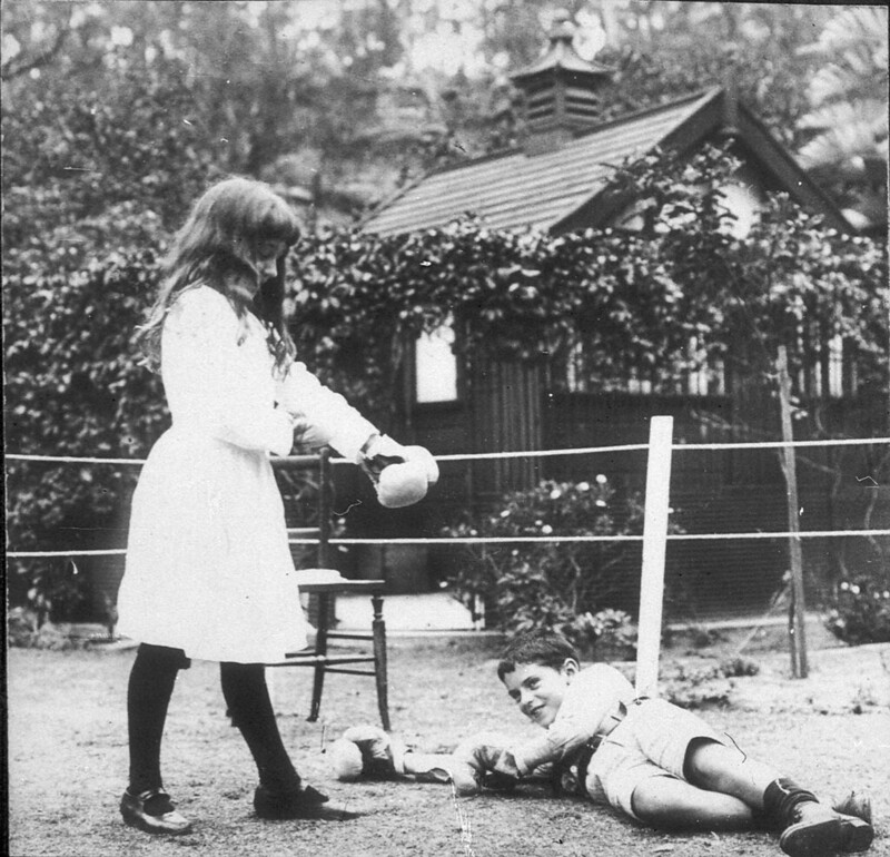 Banjo Paterson's children Grace and Hugh boxing with Christmas present gloves, Sydney, NSW, 1919 / photographer unknown
