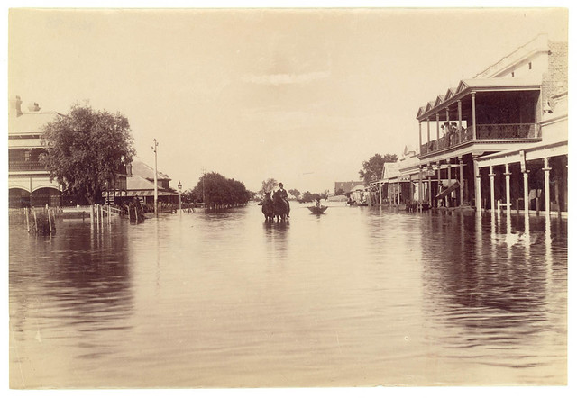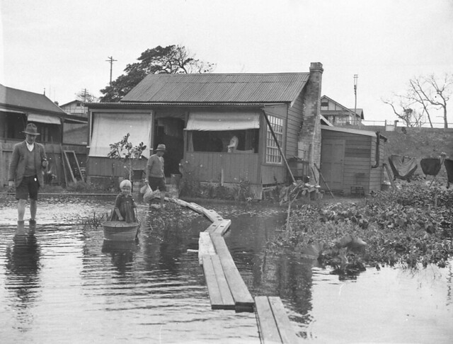 Narrabeen flooding; duck-boards for access, April 1927, by Sam Hood