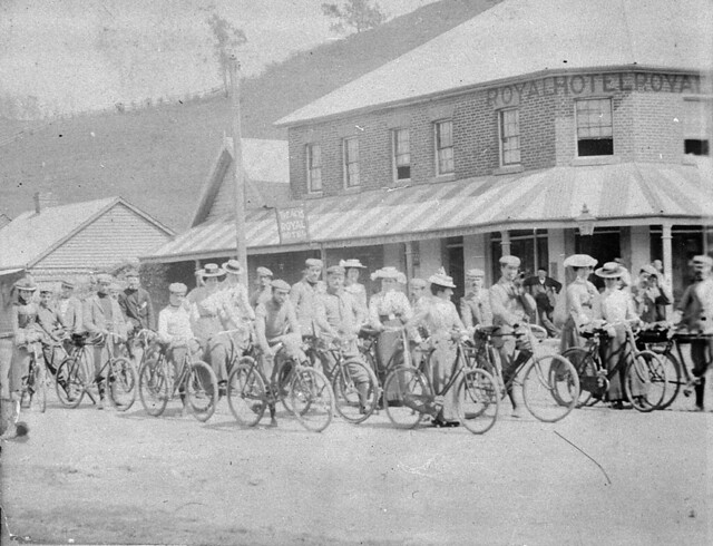 Waratah Rovers Bicycle Club (WRBC) on tour. Sydney - Campbelltown - Appin - Bulli - South Coast. Photo taken at Picton outside the Royal Hotel - Picton, NSW, October 1900