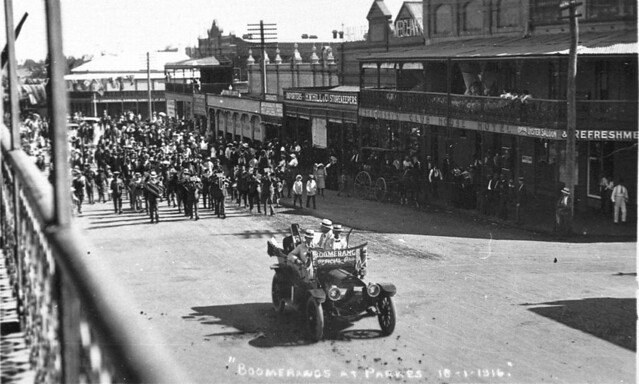 Parade of "Boomerangs" [recruitment marches, 1915-1916] up Clarinda Street on way to Sydney - Parkes, NSW, 18 January 1916 by CA Watson