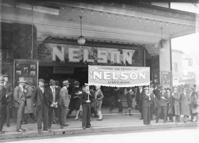 Naval League cadets in uniform march to Hoyts De Luxe Cinema, George Street, Sydney for the film "Nelson", 6 August 1928 / photographer Sam Hood