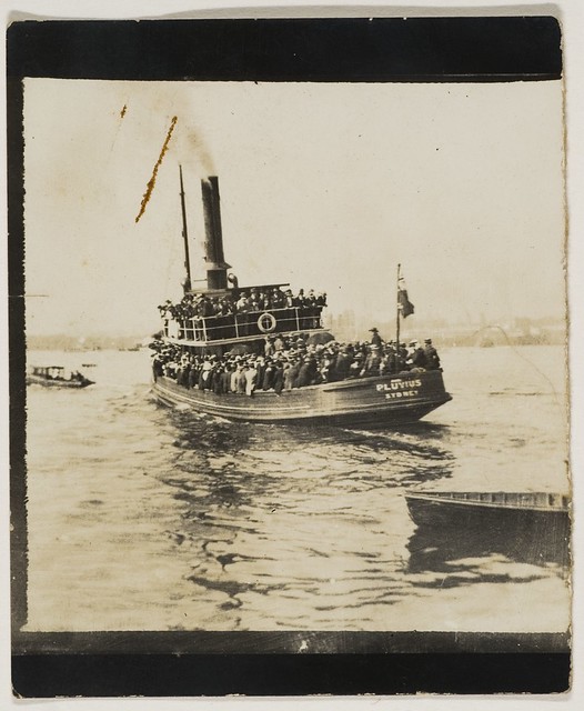 Steam tug Pluvius taking passengers who usually travelled by ferry - ferry strike, 1910 on Sydney Harbour from Royal Australian Historical Society : Sydney photographs, ca. 1879-1956