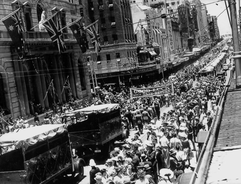Large crowd in attendance for the Anzac Day service at Anzac Square, Brisbane, ca. 1940