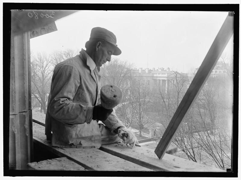 Identified! [Construction worker with mallet working on stone work at U.S. Treasury Annex, with view of White House in background. Washington, D.C.] (LOC)
