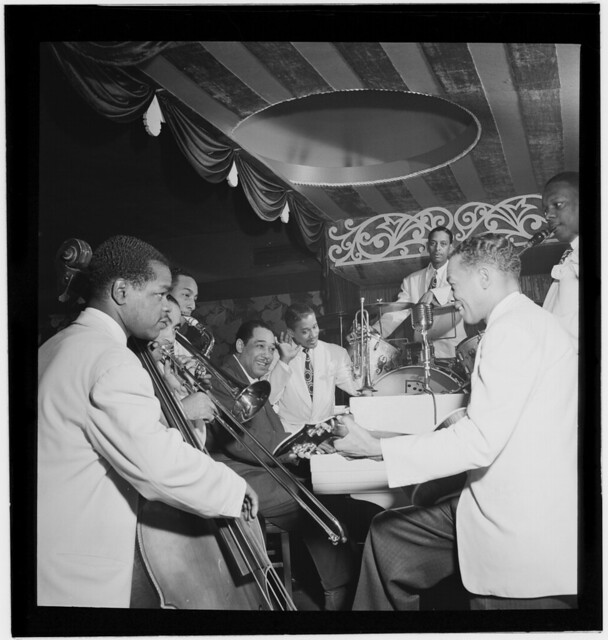 [Portrait of Junior Raglin, Lawrence Brown, Johnny Hodges, Duke Ellington, Ray Nance, Sonny Greer, Fred Guy, and Harry Carney, Aquarium, New York, N.Y., ca. Nov. 1946] (LOC)