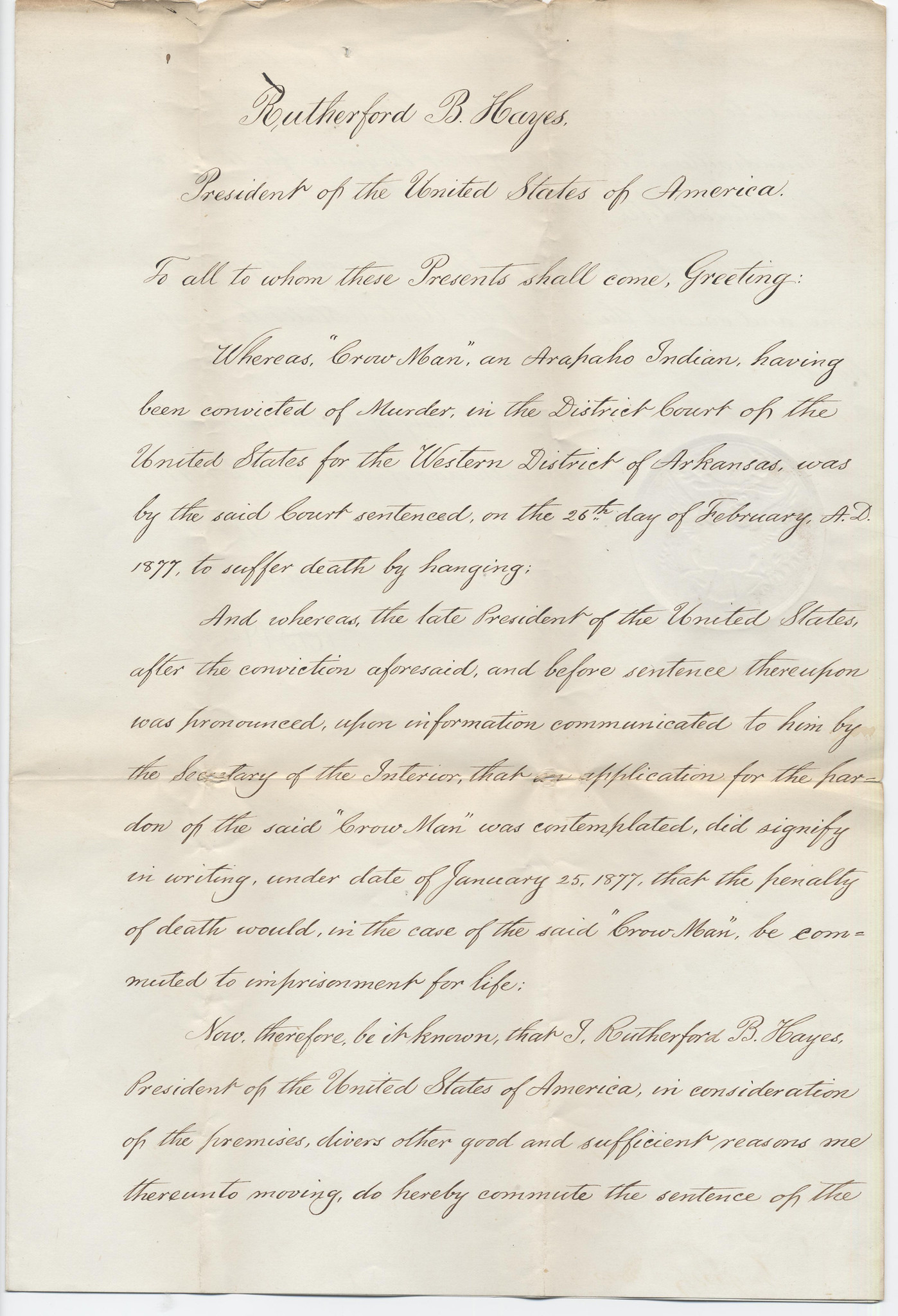 President Rutherford B. Hayes's Commutation of “Crow Man's” Death Sentence - Page 1