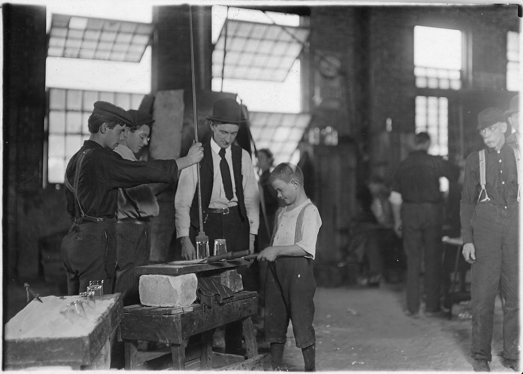 Glass blower and mold boy. Boy has 4 1/2 hours of this at a stretch; then an hour's rest and 4 1/2 more: cramped position. Day shift one week: night shift next, October 1908