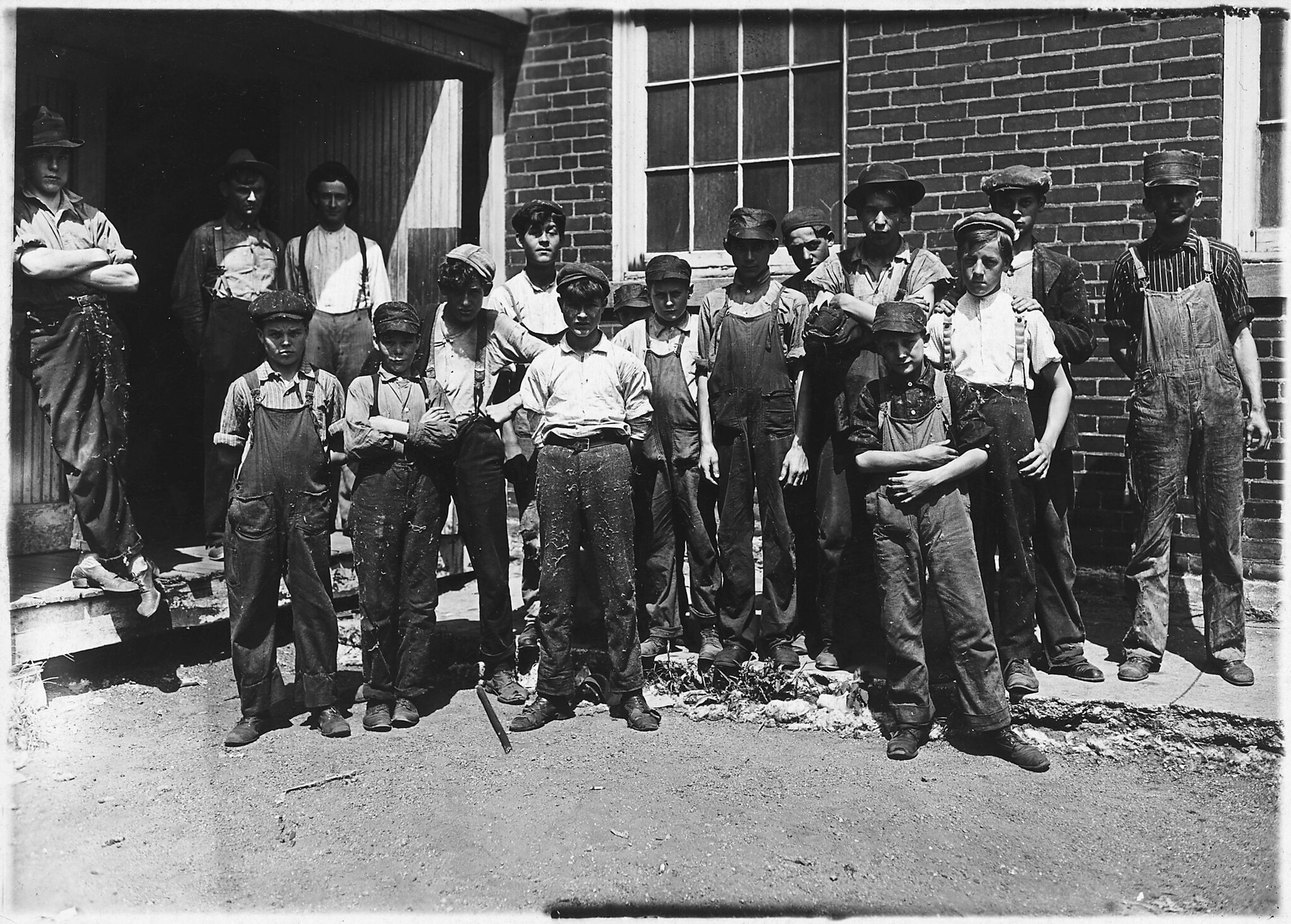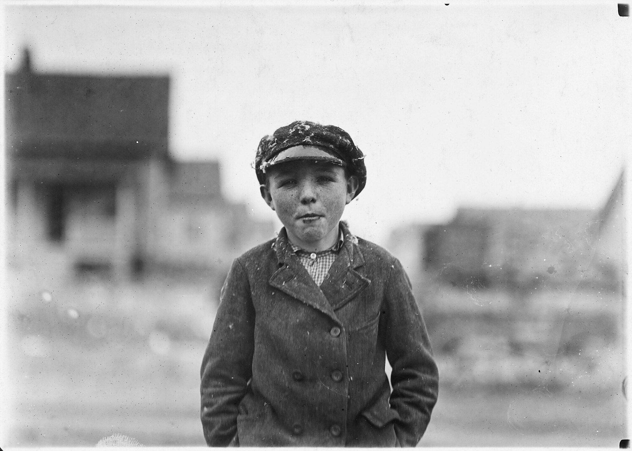 Springstein Mill. John Lewis (boy with hat), 12 years old, 1 year in mill, November 1908