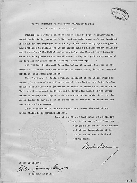 President Woodrow Wilson's Mother's Day Proclamation of May 9, 1914 (Presidential Proclamation 1268)., 05/09/1914 - 05/09/1914
