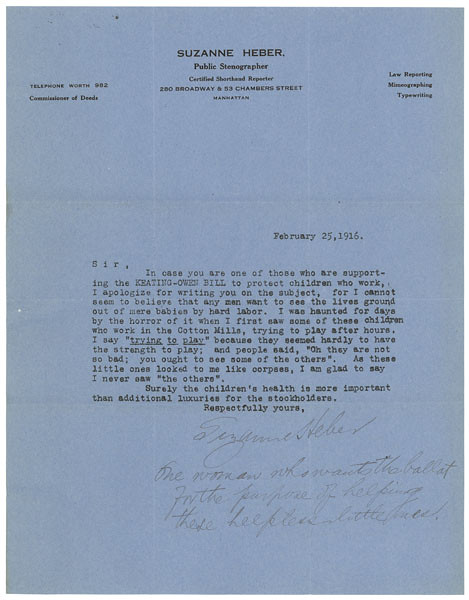 Letter from Suzanne Heber Supporting Keating-Owen Child Labor Bill, 02/25/1916