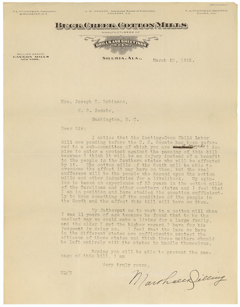 Letter from Marshall Dilling Opposing Keating-Owen Child Labor Bill, 03/20/1916