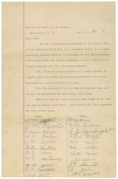 Letter from Operatives of Cherokee Falls Manufacturing Company Cotton Mill in Opposition to Keating-Owen Child Labor Bill, 01/18/1916