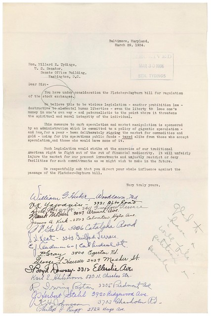 Petition from Baltimore City to Senator Millard Tydings Opposing Stock Exchange Regulation, 03/29/1934