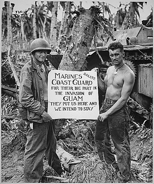 The U.S. Marines salute the U.S. Coast Guard after the fury of battle had subsided and the Japanese on Guam had been defeated. "They (the Coast Guard) Put Us Here and We Intend to Stay" is the way the