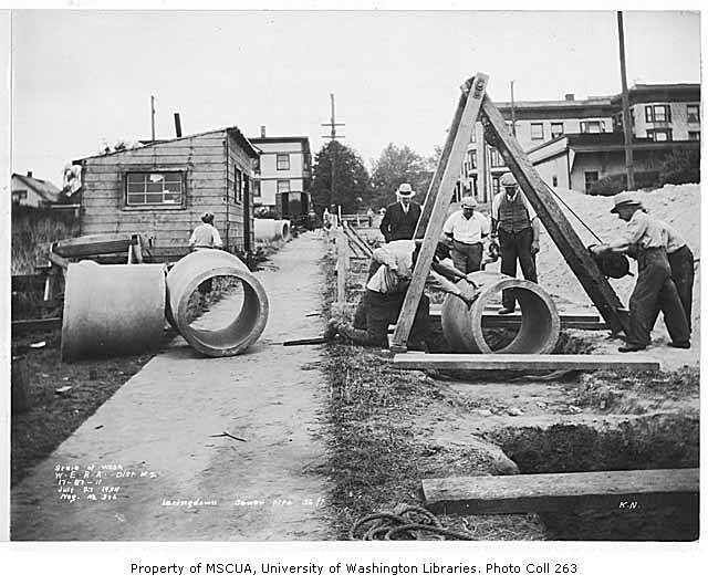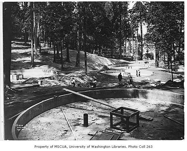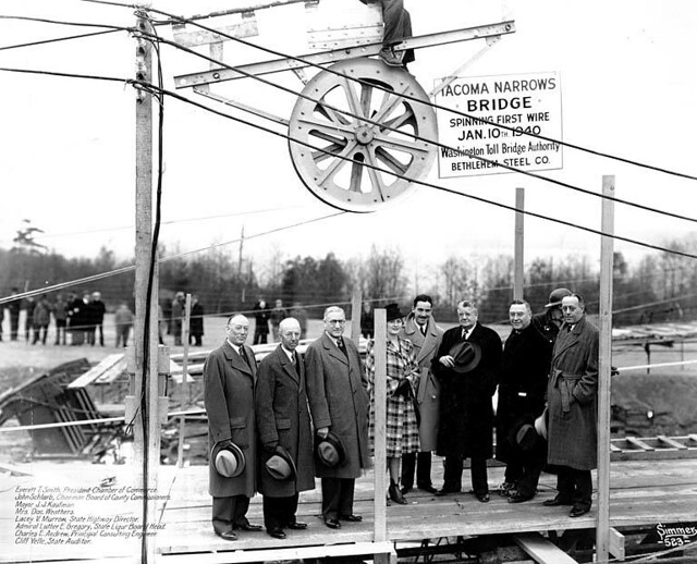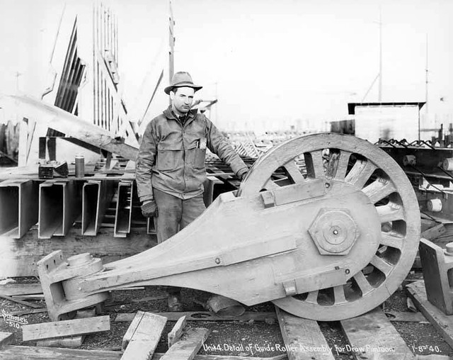 Guide roller assembly for the draw pontoon, Lake Washington Floating Bridge construction, the only concrete pontoon bridge in the world, January 8, 1940