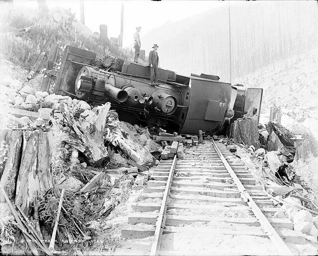 Two men standing atop wrecked locomotive on the Great Northern Railway tracks