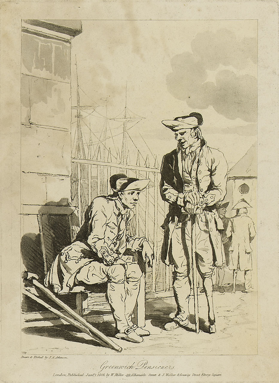 Greenwich Pensioners. One of a series of prints of seamen and shipping by Atkinson, on which see PAD7785 for further information. One man is sitting on a bench to the left by the corner of a masonry wall, with a crutch leaning on the seat beside him. The