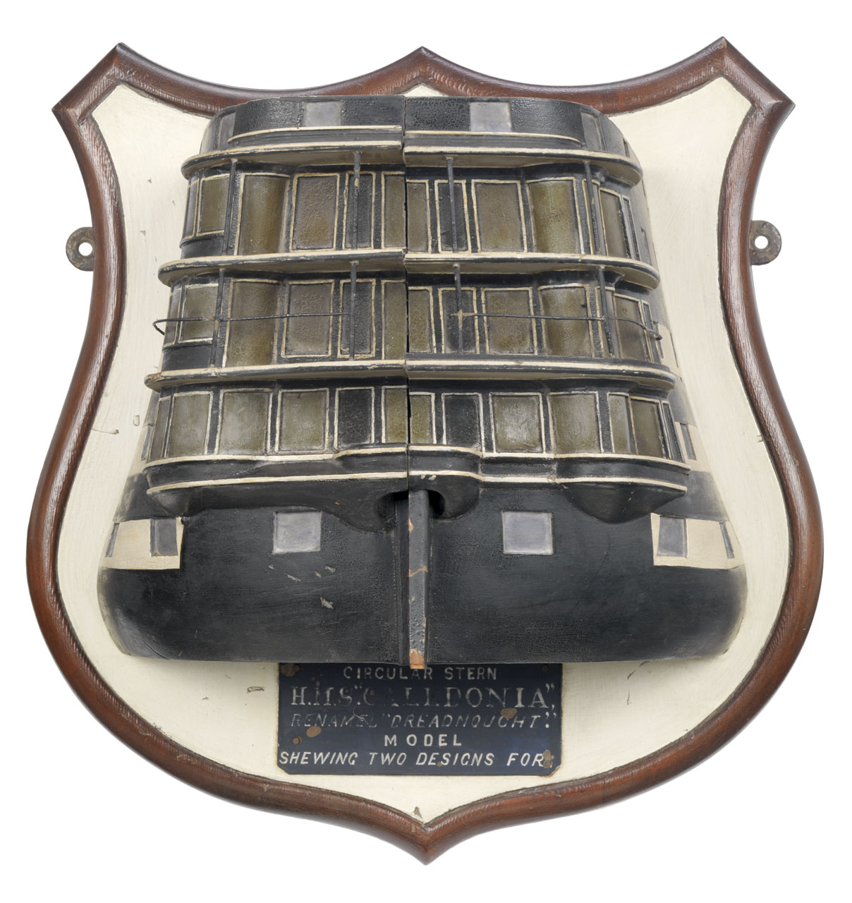 HMS Caledonia (1808); Warship; 1st rate; 120 guns. Scale: Unknown. A model made in two halves showing two designs for the circular stern for HMS Caledonia (1808), made entirely in wood with metal fittings and painted in realistic colours. The hull, rudder