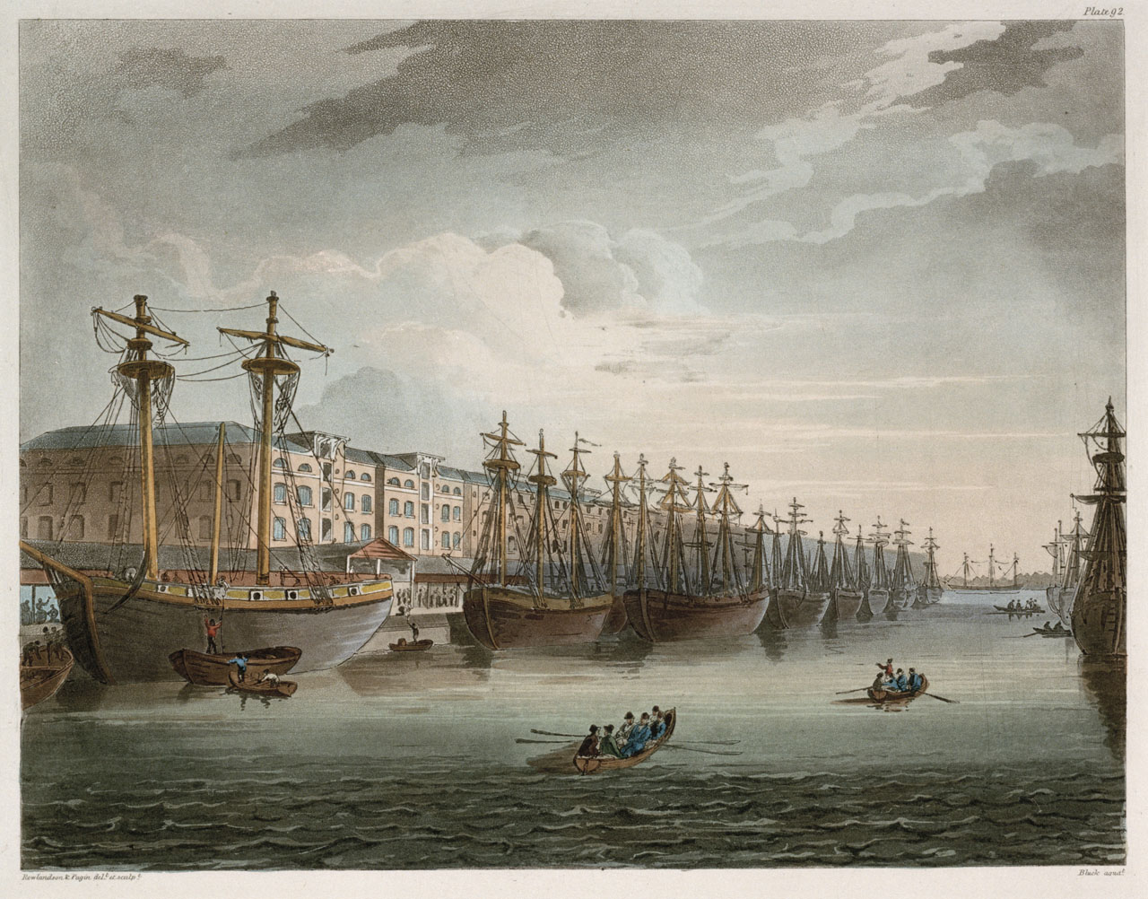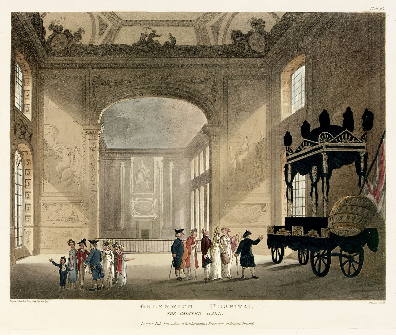 'Greenwich Hospital. The Painted Hall'. Plate 97 in vol 3 of Ackermann's 'Microcosm of London' (3 vols, 1808-11), drawn and etched by Rowlandson (who did the figures) and Pugin, aquatint by Bluck.  The view is looking west from th