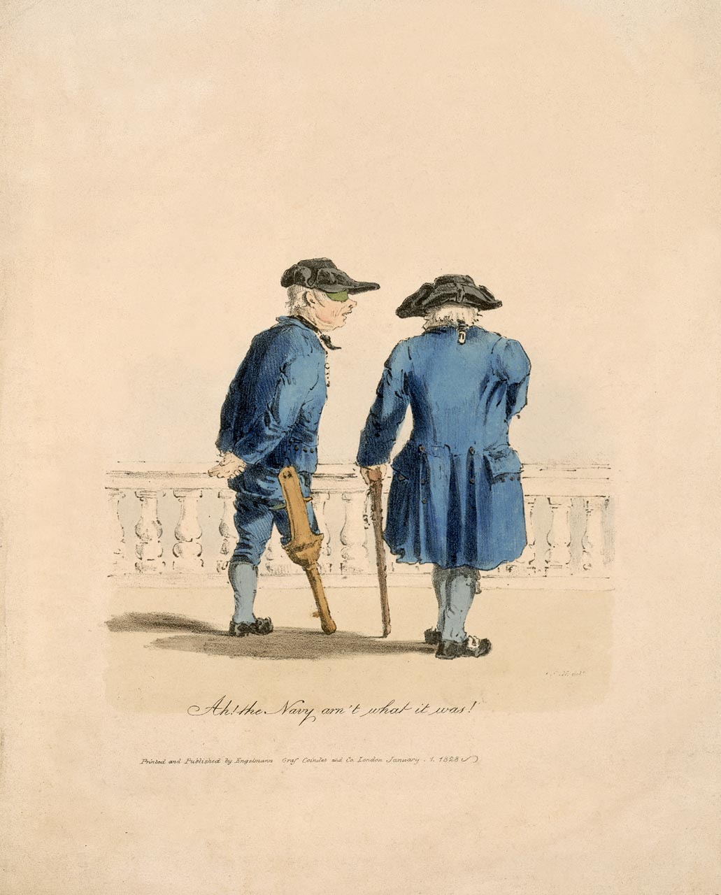 'Ah! the Navy arn't what it was!'  (Greenwich Pensioners). Two Greenwich Pensioners lamenting changing times and standards. The one on the left is in right profile with his hands behind his back, has a peg-leg right leg and a shade under hi