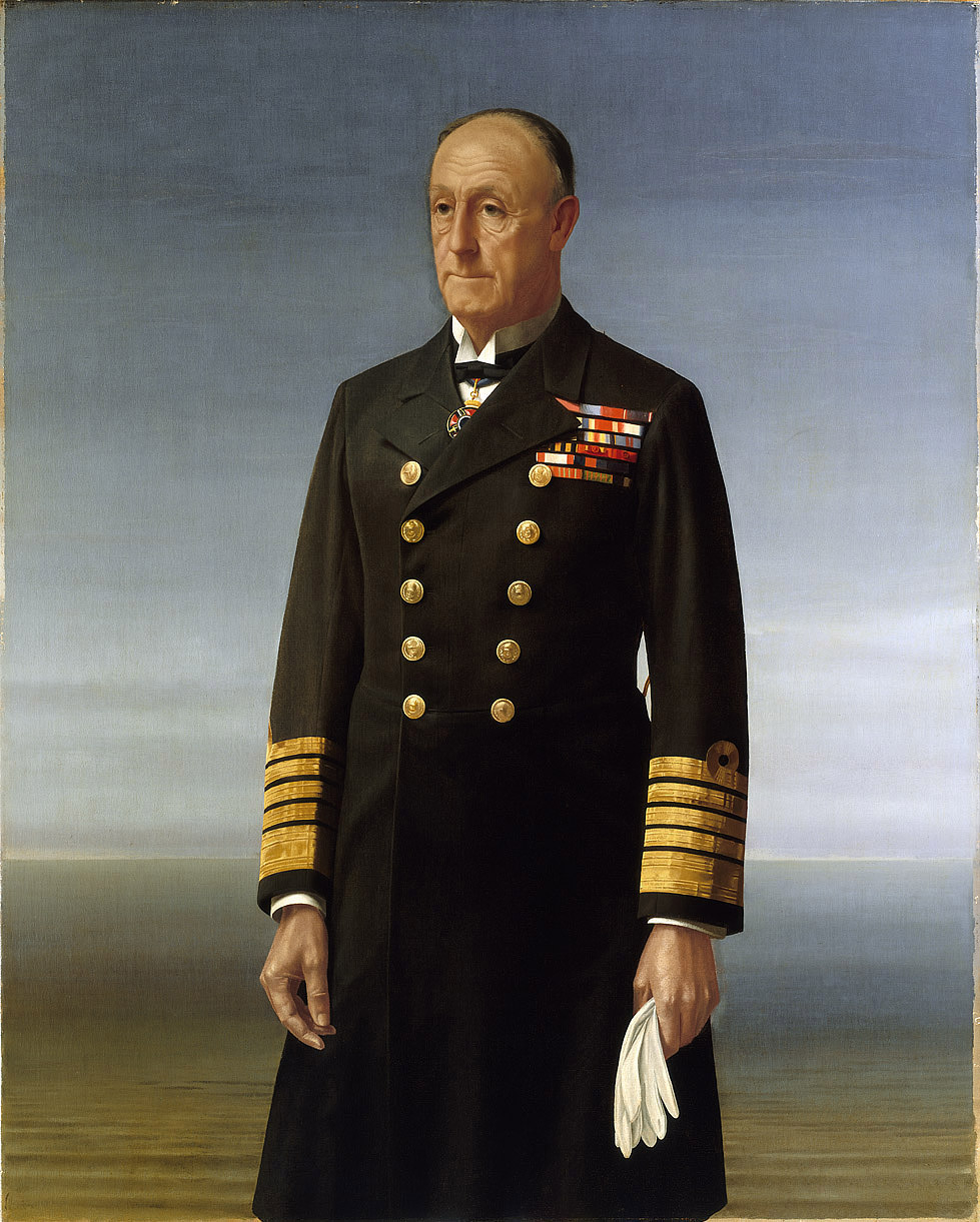 Admiral of the Fleet John Jellicoe, 1859-1935, 1st Earl Jellicoe. A three-quarter-length portrait slightly to the left, wearing an admiral of the fleet's frock coat, 1901-29. He also wears the medal ribbons and the cross of the Order of Merit, with t