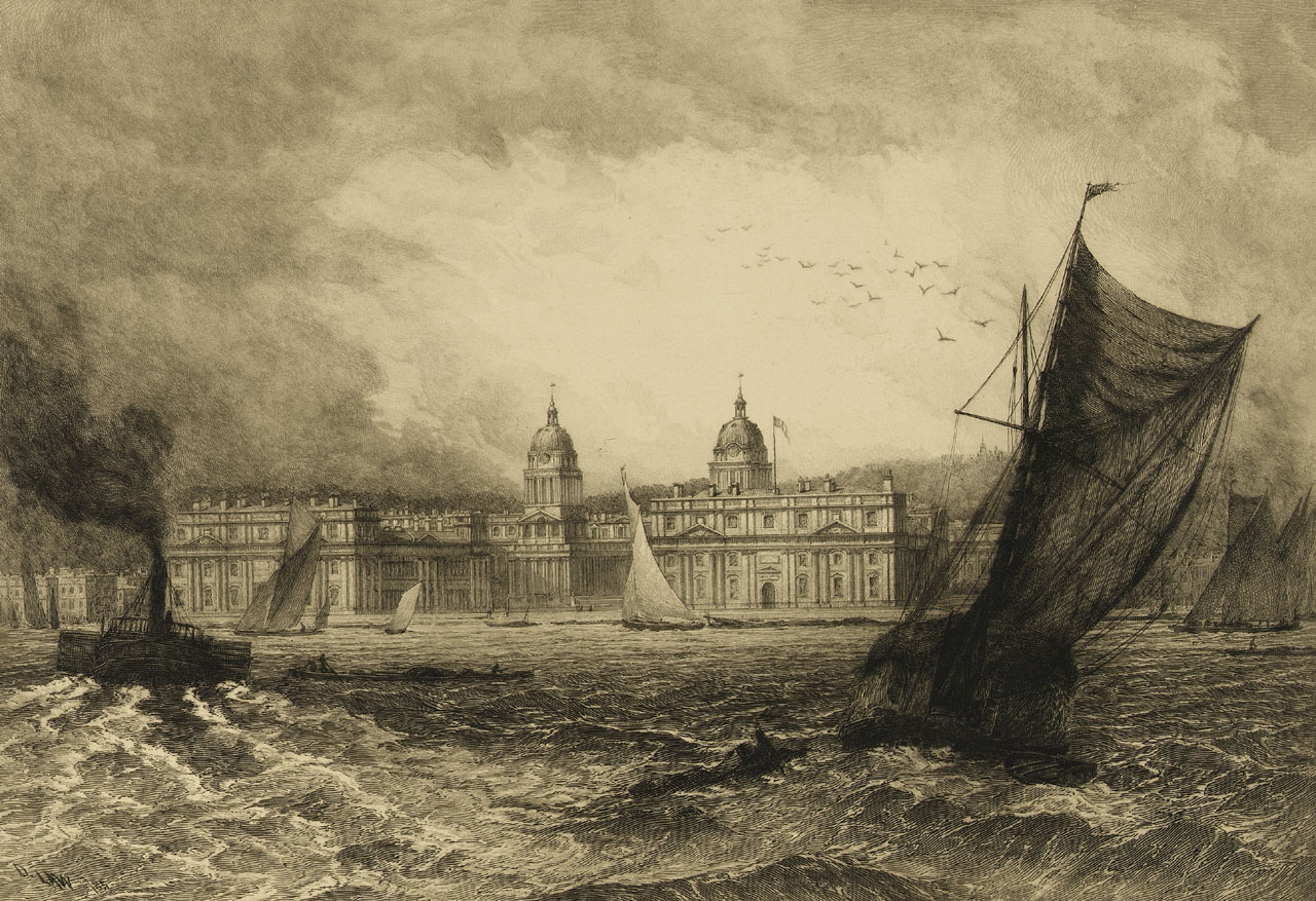 Greenwich Hospital. A view of the Royal Naval Hospital from off the Isle of Dogs to the north-west, in squally weather, with a passenger paddle steamer in stern view on the left and a Thames barge under sail inbound for London with a load of hay on the ri