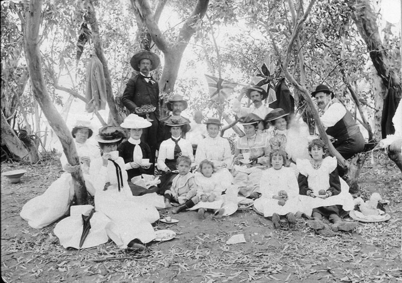 Picnic group on Federation Day at Bunker Creek above Whipstick Station, White Cliffs, NSW, 1 January 1901, by an unknown photographer.