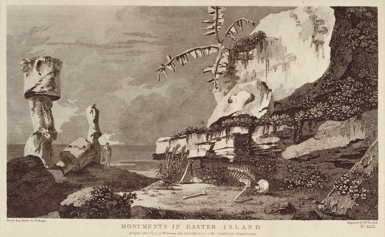 Monuments in Easter Island. This engraving, after drawings by artist William Hodges, is in John Hawkesworth's account (1773) of the voyages of Captain James Cook, Joseph Banks and Captain John Byron.