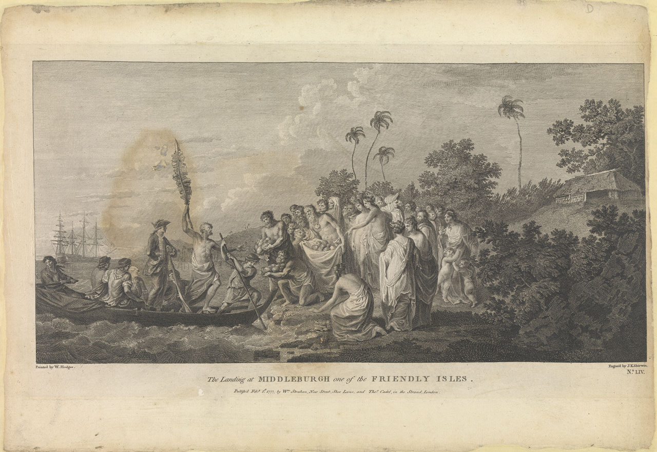 The Landing at Erramanga one of the New Hebrides. This engraving, after a drawing by artist William Hodges, comes from the official account of Cook's second voyage, 'A Voyage towards the South Pole', published by Strahan and Cadell in 1777.