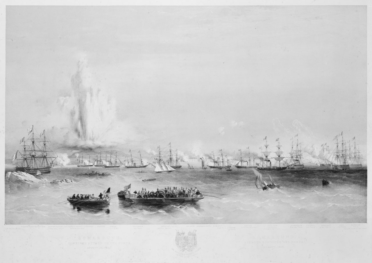 Meeting of the English and French Fleets off Baro Sound June 13 1854 (shows Gondola R.Y.S. also wood paddle sloop Driver. Print